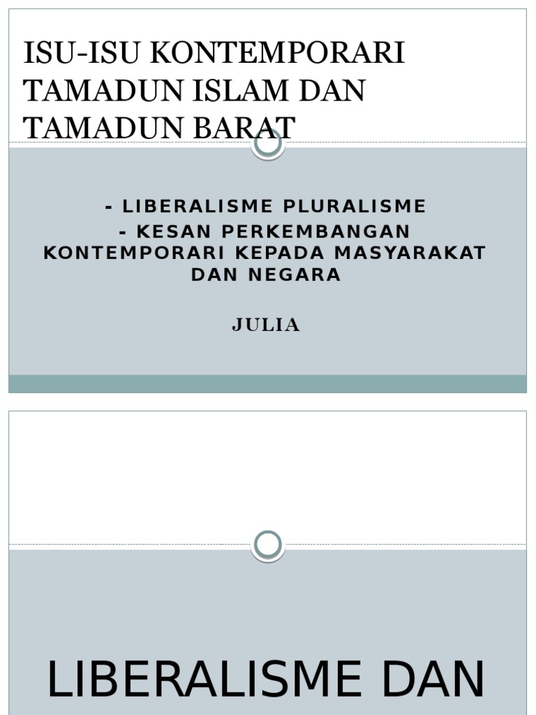 The liberalism philosophy is none to be implemented holistically as defined by the west. Gerakan islam liberal mengambil landskap renaissance di barat sebagai asas kepada semangat pembebasan yang mereka inginkan. Pluralisme agama di malaysia muncul dari gerakan liberalismeindonesia. Kajian ini memfokuskan kepada liberalisme agama yang dibawa oleh g25 yang mengkritik undang undang khalwat sebagai menceroboh peribadi orang awam. Antara agenda golongan ini ialah memperjuangkan fahaman pluralisme agama dengan menyamatarafkan semua agama, agar kedudukan agama islam sebagai agama yang paling benar dapat dihapuskan.